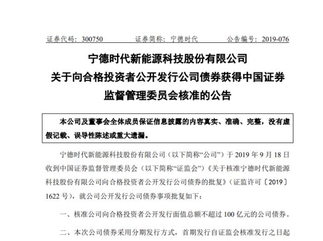 寧德時代將發行總額不超過100億債券